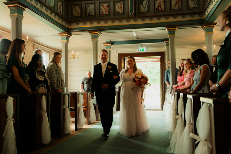 Solveig og Erlend sin dag i Kristiansand var alt man kan ønske seg – strålende sol, fargerike blomster og ekte følelser fra start til slutt. Midt i alt det festlige tok de seg tid til en privat stund der de vasket føttene til hverandre – et sterkt og vakkert symbol på ønsket om å tjene hverandre i ekteskapet. Dagen ble avsluttet med solnedgang og en livlig fest på låven, fylt med latter, tårer og kjærlighet.